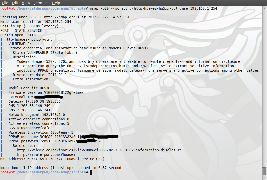 A new NSE script called "http-huawei-hg5xx-vuln" has been added to Nmap which exploits a couple of vulnerabilities found in Huawei HG5XX modems.